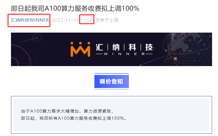 鉴于此,自即日起,汇纳科技股份有限公司拟将所受托运营的内嵌英伟达A100芯片的高性能算力服务器算力服务收费同步上调100%。目前,此次价格调整暂不会对公司经营业绩产生重大影响。