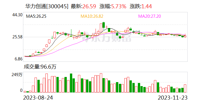 11月23日盘中,北斗导航概念股异动,东方财富北斗导航板块整体上涨0.95%。其中,华力创通(300045.SZ)早盘一度涨近10%,午后涨幅收窄,截至收盘报26.59元/股,涨5.73%。天迈科技(300807.SZ)盘中一度涨近7%,收报38.73元/股,涨5.88%。另外,富临运业(002357.SZ)、路畅科技(002813.SZ)、中海达(300177.SZ)涨幅居前。