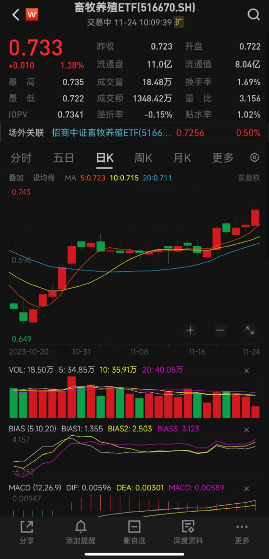 11月24日,畜牧板块受利好冲高。截至10时4分,畜牧养殖etF(516670)放量涨1.38%,一度涨1.66%,盘中冲击三连阳;成分股新五丰、巨星农牧、晓鸣股份、益生股份涨幅居前。